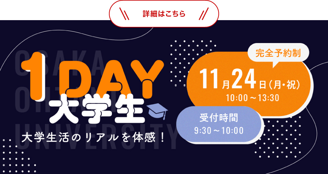 オープンキャンパスにご参加いただくにあたり、特別な配慮が必要な場合は、開催日の2週間前までに以下の連絡先にご相談ください。 入試広報課:0721-24-1031 |