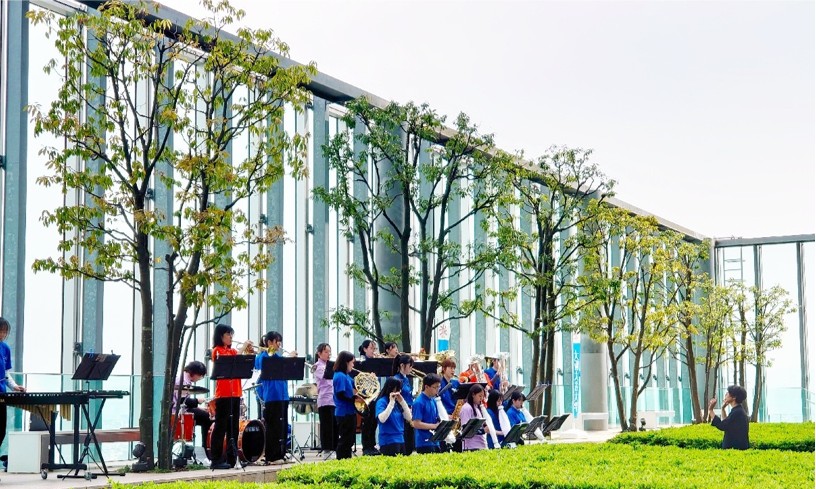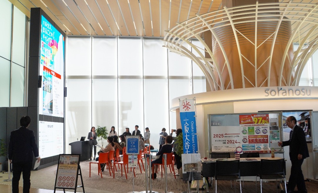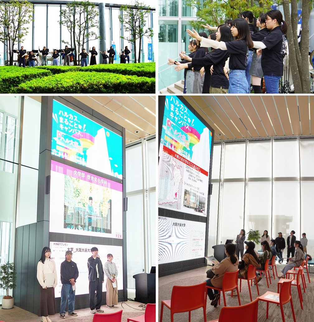2025 年度 ハルカス大学祭 (春)[4月 19 日(土)於:あべのハルカス]では、吹奏楽部、手話クラブ Sign に所属する学生がパフォーマンスを披露するとともに、ハルカス大学に参画する大学のことをもっと気軽に知っていただこうと、17 階soranosu において、本学をはじめ、四天王寺大学、阪南大学との合同開催にて大学紹介プレゼンテーション企画を行いました。 https://harudai.jp/special/fest2025spr/