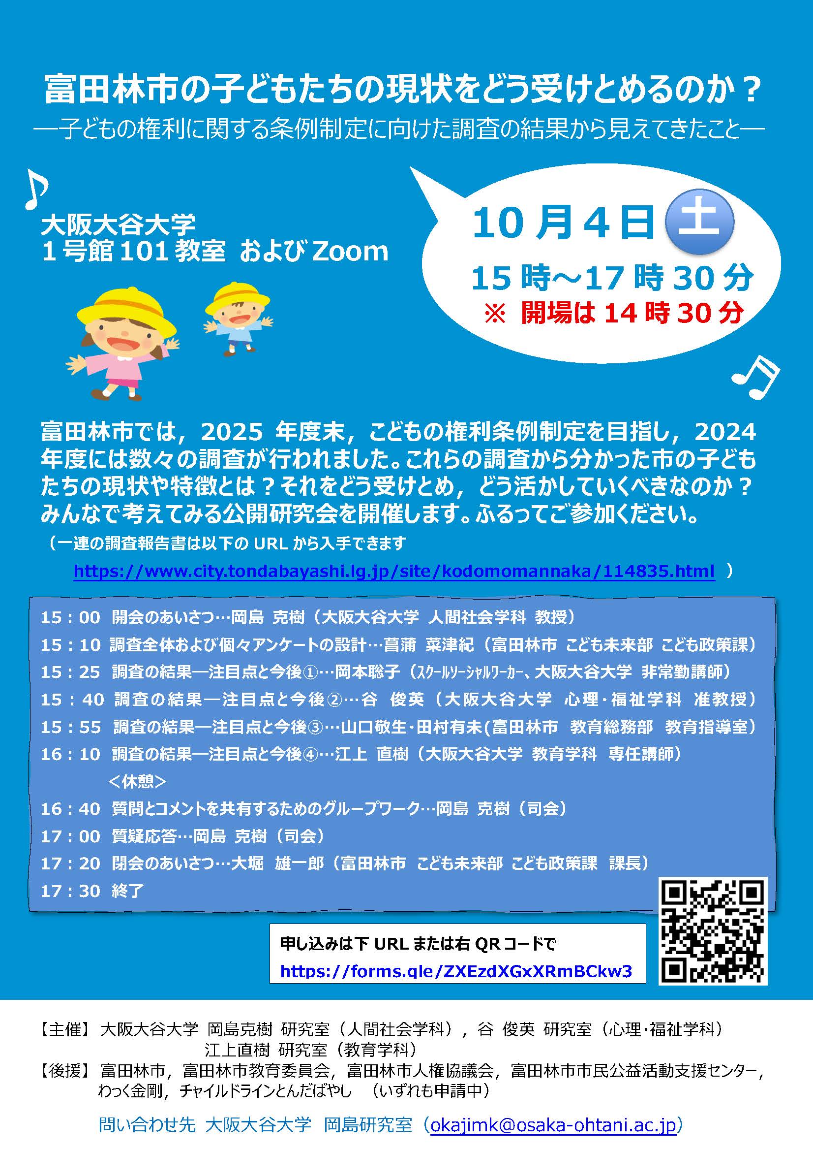 なお、本公開研究会は、富田林市、富田林市教育委員会、富田林市、富田林市人権協議会、富田林市市民公益活動支援センター、わっく金剛、チャイルドラインとんだばやし(いずれも申請中)からのご後援をいただき開催する予定です。