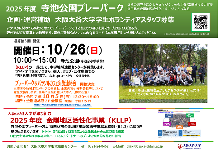 富田林市金剛地区の住民等で構成する「寺池公園等を活かしたまちづくりの会」では、地域活動・コミュニティ形成の象徴として、寺池公園の魅力を多くの方々に実体験してもらおうと取り組んでおられ、同時に、広く発信されています。この取組はまた、まちづくりの継続性の確保に向けた「新たな形」として模索されており、同時に、多世代交流のための「場」にもなっています。学生にとっては、地域をフィールドとした、正に、学びの実践の場でもあります。大阪大谷大学においては、2022年度 第 1 回開催から、学生がボランティアとしてプレーパークに参加しています。昨年度は、文学部・教育学部・人間社会学部から計21名の本学学生が学生スタッフとして活躍しました。2025年度も、本学においては、金剛地区活性化プロジェクト【KLLP】の一環として、地域連携センターが窓口となり、この活動に参加する予定です。