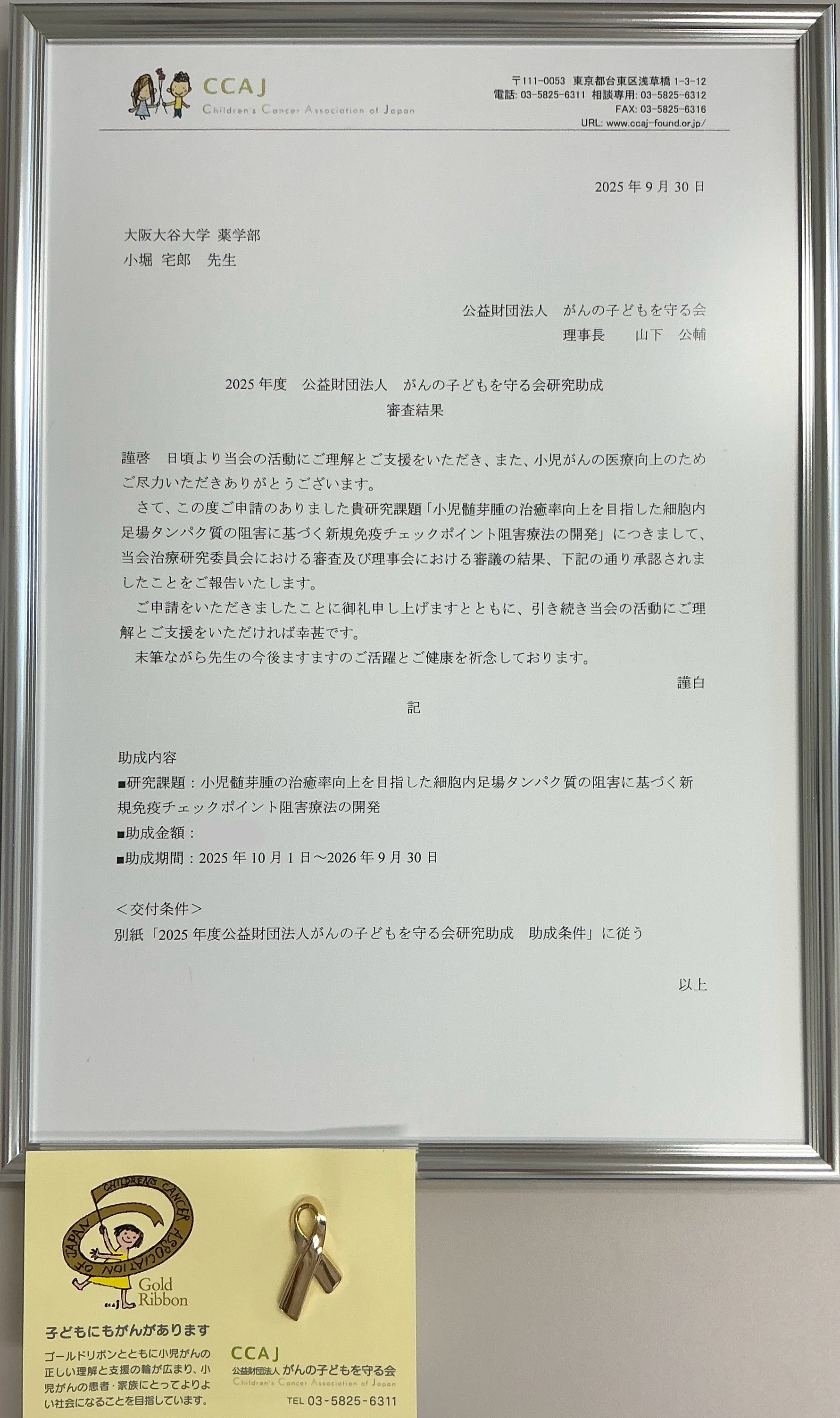 このたび、小堀 宅郎 講師が公益財団法人がんの子どもを守る会(のぞみ財団)2025 年度がんの子どもを守る会研究助成* の交付対象者に選ばれました。同財団の 2023 年度、2024 年度の研究助成に続いて、3 年連続での採択となります。