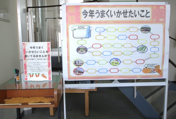 あなたが今年「前に進みたいこと」「うまくいかせたいこと」を“にんじんカード”に書いて、壁面の“やる気スイッチ”にペタッ!