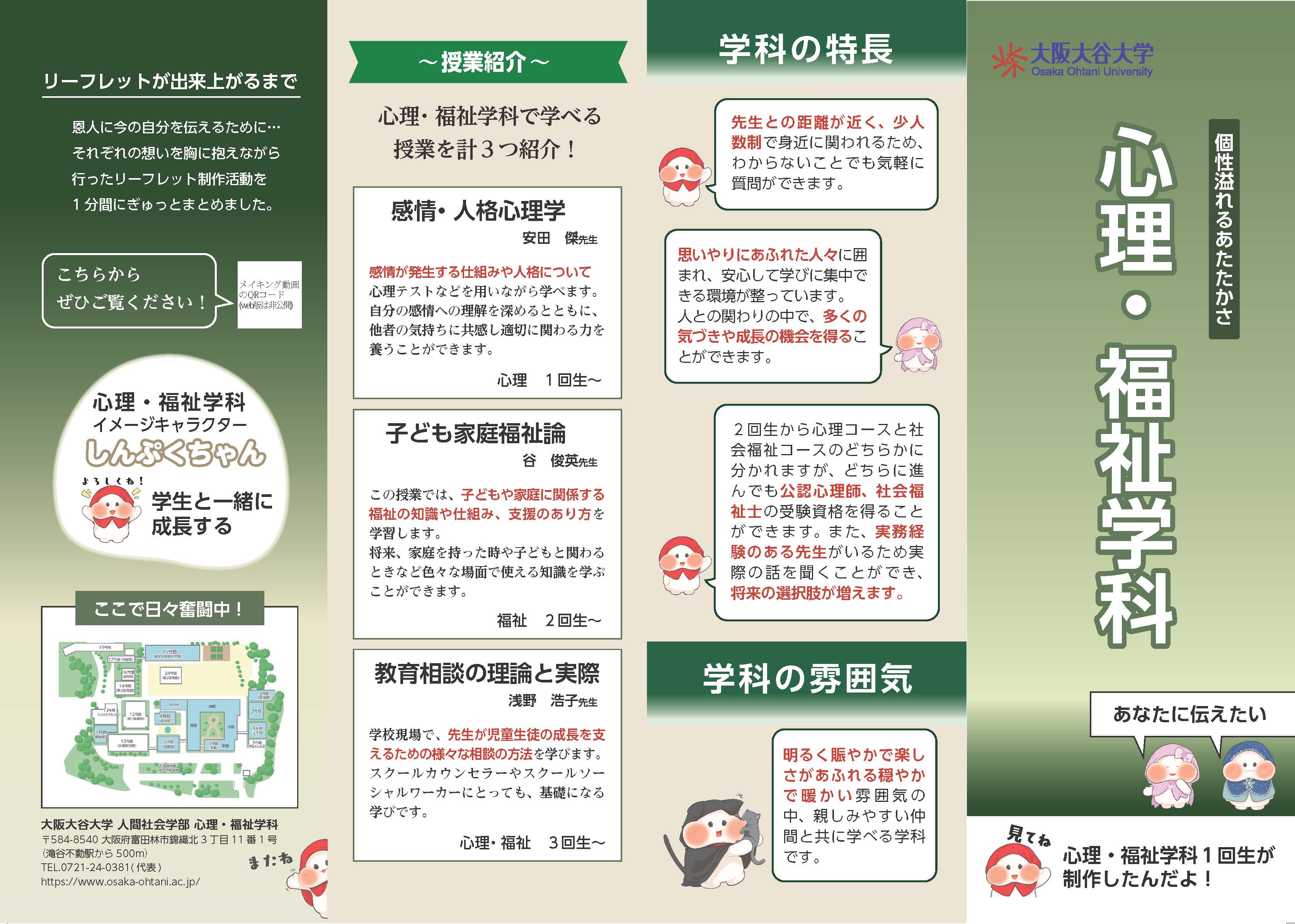人間社会学部心理・福祉学科では、建学の精神である「報恩感謝」教育の一環として、1年生が中心となって学科リーフレットを制作しています。 学科での学びや学生生活を「伝える側」として言語化することで、自分たちの学びを振り返ると同時に、これまでお世話になった方々へリーフレットを持参し、感謝を伝える機会としています。 完成したリーフレットは、オープンキャンパス等でも配布いたします。