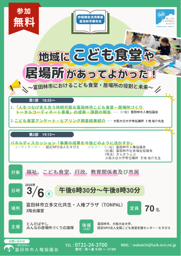 『休眠預金活用事業富田林市報告会 ~地域にこども食堂や居場所があってよかった!~』 が開催されます。